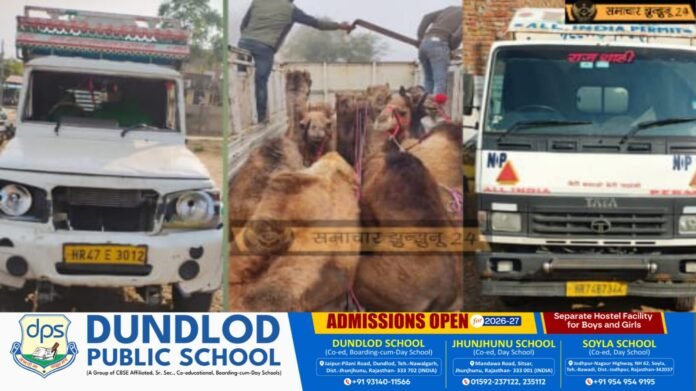 खेतड़ी नगर में ऊंट तस्करी पर बड़ा एक्शन: 2 अलग-अलग मामलों में 11 उंट मुक्त, 2 वाहन जब्त, 2 आरोपी गिरफ्तार