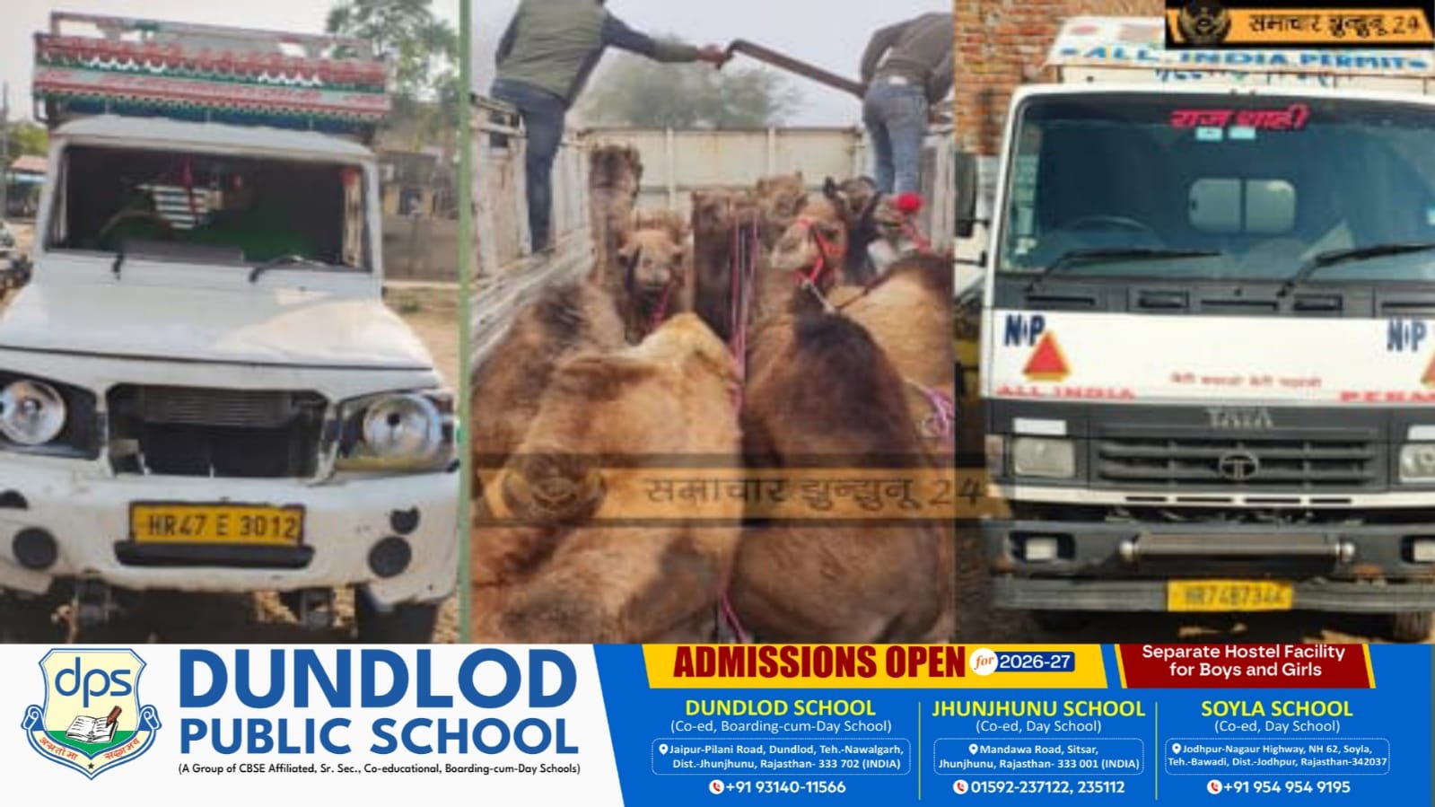 दिनांक 28 जनवरी 2026 को गश्त के दौरान मुखबिर की सूचना पर माता शिलाटी मंदिर के पास हरियाणा नंबर की पिकअप HR 47 E 3012 को रोका गया। वाहन में 3 मादा ऊंटों को पैर और मुंह बांधकर अमानवीय हालत में बैठाया गया था, जिससे वे गंभीर पीड़ा में थीं। उंटों के शरीर पर कई जगह रगड़ के घाव, चोटें और कमजोरी के निशान पाए गए, जबकि एक मादा उंट बेहोशी की हालत में थी।