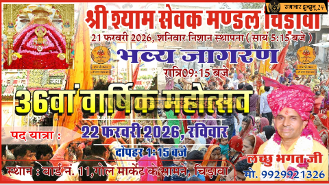 चिड़ावा: शहर एक बार फिर बाबा श्याम की भक्ति के रंग में रंगने जा रहा है। श्री श्याम सेवक मंडल चिड़ावा की ओर से 36वें वार्षिक महोत्सव का आयोजन 21 और 22 फरवरी को श्रद्धा, भक्ति और परंपरा के साथ किया जाएगा। निशान स्थापना, रात्रि जागरण और खाटू श्याम मंदिर के लिए पदयात्रा जैसे कार्यक्रमों के माध्यम से यह महोत्सव न केवल धार्मिक आस्था को मजबूती देगा, बल्कि क्षेत्र में आध्यात्मिक ऊर्जा का संचार भी करेगा। सभी आयोजन लच्छु भगत के सानिध्य में संपन्न होंगे।