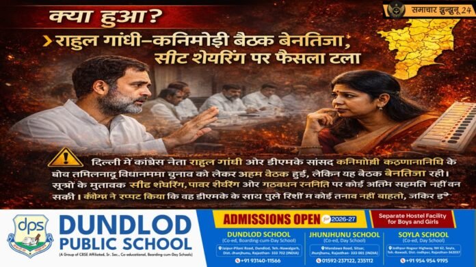 तमिलनाडु: विधानसभा चुनाव को लेकर कांग्रेस और डीएमके के बीच राजनीतिक हलचल तेज हो गई है। दिल्ली में राहुल गांधी और कनिमोझी करुणानिधि की अहम बैठक के बावजूद सीट शेयरिंग, पावर शेयरिंग और गठबंधन रणनीति पर कोई अंतिम निर्णय नहीं हो सका, जिससे तमिलनाडु चुनाव, कांग्रेस–डीएमके गठबंधन और सीट बंटवारा फॉर्मूला को लेकर सियासी अटकलें और तेज हो गई हैं।
