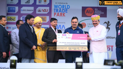 पिलानी: कस्बे के होनहार धावक राहुल कटारिया ने जयपुर में आयोजित एयू बैंक फुल मैराथन 2026 में शानदार प्रदर्शन करते हुए पुरुष एलीट वर्ग में तीसरा स्थान हासिल किया। इस उपलब्धि पर मुख्यमंत्री भजनलाल शर्मा ने 25 हजार रुपये की इनामी राशि का चेक प्रदान किया। राहुल की सफलता से पिलानी खेल जगत में उत्साह और गर्व का माहौल है।