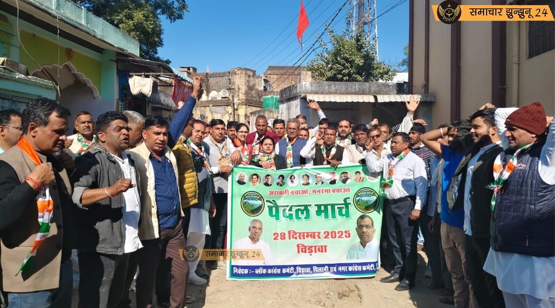 चिड़ावा: राजस्थान में अरावली पर्वतमाला की परिभाषा बदलने और कथित तौर पर मनरेगा योजना को कमजोर किए जाने के विरोध में कांग्रेस ने एक बार फिर सड़क पर उतरकर विरोध दर्ज कराया। चिड़ावा शहर में कांग्रेस कमेटी द्वारा पिलानी विधायक पितराम सिंह काला के नेतृत्व में पैदल मार्च निकाला गया, जिसने राजनीतिक और पर्यावरणीय बहस को तेज कर दिया। यह मार्च कांग्रेस कार्यालय से शुरू होकर मुख्य बाजार होते हुए गांधी चौक तक पहुंचा, जहां बड़ी संख्या में कांग्रेस कार्यकर्ता और स्थानीय नागरिक मौजूद रहे