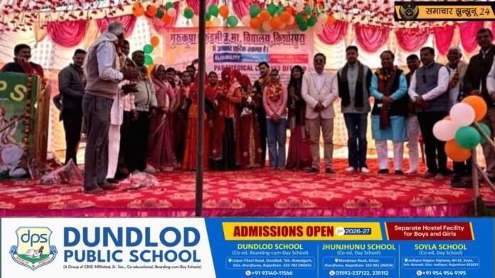 झुंझुनूं: किशोरपुरा के गुरु कृपा अकेडमी उच्च माध्यमिक विद्यालय में गणतंत्र दिवस 2026 की पूर्व संध्या पर देशभक्ति, शिक्षा, सम्मान समारोह और सांस्कृतिक कार्यक्रम से सजा भव्य आयोजन हुआ। इस दौरान 125 प्रतिभाशाली विद्यार्थियों को सम्मानित किया गया, वहीं जयपुर से आए वरिष्ठ अधिवक्ता संजय महला ने छात्रों को राष्ट्र निर्माण, अनुशासन और लक्ष्य निर्धारण का संदेश दिया। यह आयोजन किशोरपुरा शिक्षा समाचार, विद्यालय सम्मान समारोह, और गणतंत्र दिवस कार्यक्रम राजस्थान के लिहाज से खास रहा।