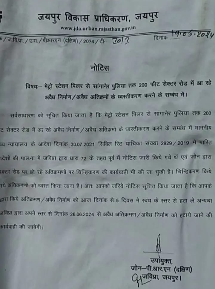 जेडीए के मुख्य नियंत्रक महेंद्र कुमार शर्मा ने बताया कि अवैध निर्माण के खिलाफ लगातार कार्रवाई की जा रही है। उन्होंने कहा, “न्यू सांगानेर रोड से अवैध निर्माण हटाने के लिए अतिक्रमियों को 5 दिन का समय दिया गया था, लेकिन जिन्होंने इस अवधि में अपने निर्माण नहीं हटाए, उनके खिलाफ अब बुलडोजर की मदद से कार्रवाई की जाएगी।”