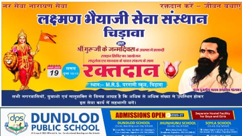 चिड़ावा: शहर में सामाजिक सेवा और मानवता का संदेश देने वाला एक विशेष आयोजन होने जा रहा है। माधव सदाशिव गोलवलकर के जन्मदिवस के अवसर पर लक्ष्मण भैयाजी सेवा संस्थान द्वारा 19 फरवरी 2026 को शताब्दी रक्तदान शिविर का आयोजन किया जाएगा। यह शिविर प्रातः 10:15 बजे से एम.आर.एस. परनामी स्कूल परिसर में प्रारंभ होगा।