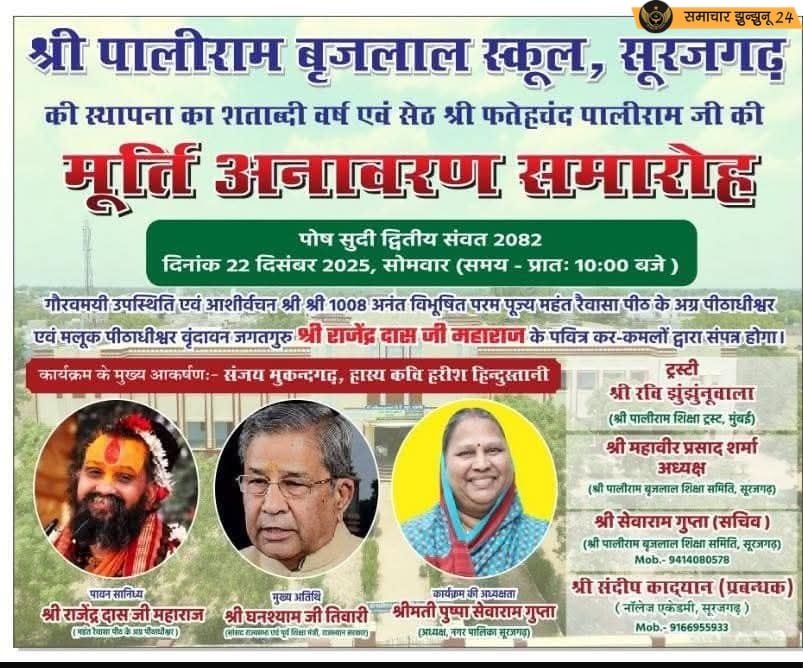 सूरजगढ़: शेखावाटी अंचल के प्रतिष्ठित शैक्षणिक संस्थान पालीराम बृजलाल स्कूल सूरजगढ़ अपने स्थापना के शताब्दी वर्ष में प्रवेश कर चुका है। इसी ऐतिहासिक अवसर पर विद्यालय परिसर में सेठ फतेहचंद पालीराम की स्मृति में मूर्ति अनावरण समारोह का आयोजन किया जा रहा है। यह आयोजन शिक्षा, समाज और सांस्कृतिक मूल्यों के प्रति विद्यालय की दीर्घकालिक प्रतिबद्धता को दर्शाएगा, जिसमें धार्मिक, राजनीतिक और शैक्षणिक क्षेत्र की प्रमुख हस्तियों की उपस्थिति रहेगी।
