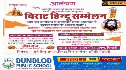 पिलानी: कस्बे में धार्मिक-सांस्कृतिक चेतना को सशक्त करने के उद्देश्य से 14 फरवरी को विराट हिन्दू सम्मेलन का आयोजन किया जा रहा है। श्याम मन्दिर प्रांगण में होने वाले इस सम्मेलन को लेकर आयोजन समिति ने तैयारियों को अंतिम रूप दे दिया है। सम्मेलन से पहले भव्य कलश यात्रा निकाली जाएगी, जिससे पूरे क्षेत्र में धार्मिक उत्साह का माहौल बनेगा।