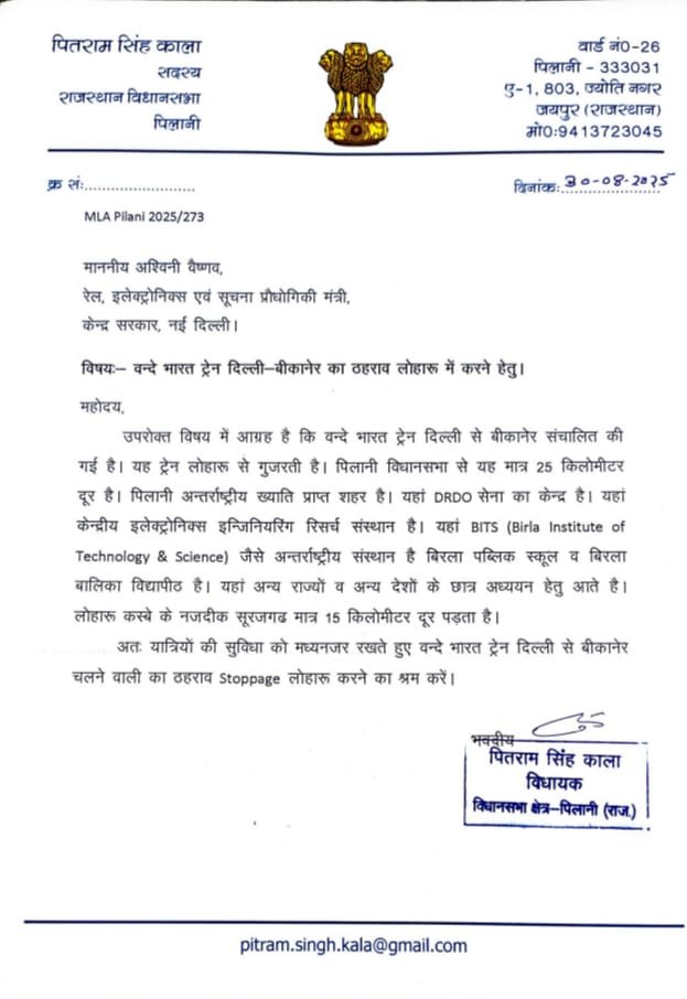 रेलवे बोर्ड द्वारा जारी ट्रेन के विस्तृत शेड्यूल के अनुसार बीकानेर से दिल्ली कैंट के लिए चलने वाली वन्दे भारत ट्रेन (26471-26472) का अब लोहारू रेलवे स्टेशन पर भी ठहराव होगा। शुक्रवार को छोड़ कर वन्दे भारत ट्रेन सप्ताह में 6 दिन लोहारू स्टेशन पर रुकेगी। पिलानी विधायक पितराम सिंह काला ने इसके लिए रेल मंत्री अश्विनी वैष्णव और झुंझुनू सांसद बिजेंद्र सिंह ओला का आभार व्यक्त किया है।