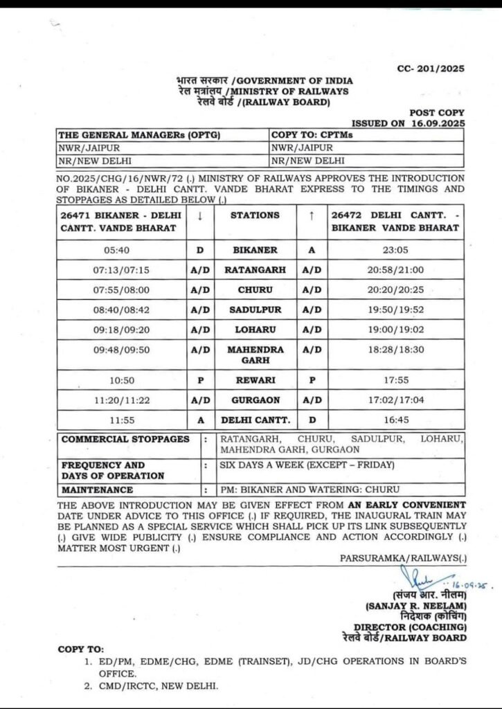 पिलानी, 20 सितंबर: उत्तर पश्चिम रेलवे जल्द ही यात्रियों को तेज और आधुनिक रेलयात्रा का नया अनुभव देने जा रहा है। बीकानेर से दिल्ली कैंट के बीच 25 सितंबर से वंदे भारत ट्रेन का संचालन शुरू हो जाएगा। रेलवे बोर्ड ने इसका विस्तृत शेड्यूल जारी कर दिया है। यह ट्रेन सप्ताह में 6 दिन (शुक्रवार को छोड़कर) चलाई जाएगी।
