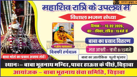 चिड़ावा: महाशिवरात्रि 2026 के पावन अवसर पर चिड़ावा शहर एक बार फिर शिवभक्ति के रंग में रंगने जा रहा है। पॉवर हाउस के पीछे स्थित प्रसिद्ध बाबा भूतनाथ मंदिर में 15 फरवरी 2026 की रात्रि को भव्य भजन संध्या का आयोजन किया जाएगा, जहां प्रसिद्ध भजन गायक विक्की हर्षवाल अपनी पार्टी के साथ भक्तिमय प्रस्तुतियां देंगे। इस दौरान बाबा भूतनाथ का दिव्य और आलौकिक श्रृंगार किया जाएगा तथा बड़ी संख्या में श्रद्धालुओं के पहुंचने की संभावना है।