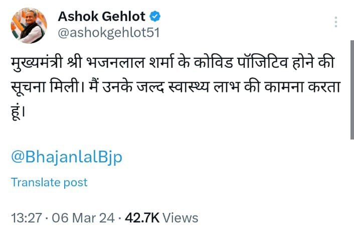 मुख्यमंत्री भजनलाल शर्मा के कॉविड संक्रमित होने की सूचना मिलने पर पूर्व मुख्यमंत्री अशोक गहलोत ने उनके जल्द स्वस्थ होने की कामना करते हुए ट्वीट किया।