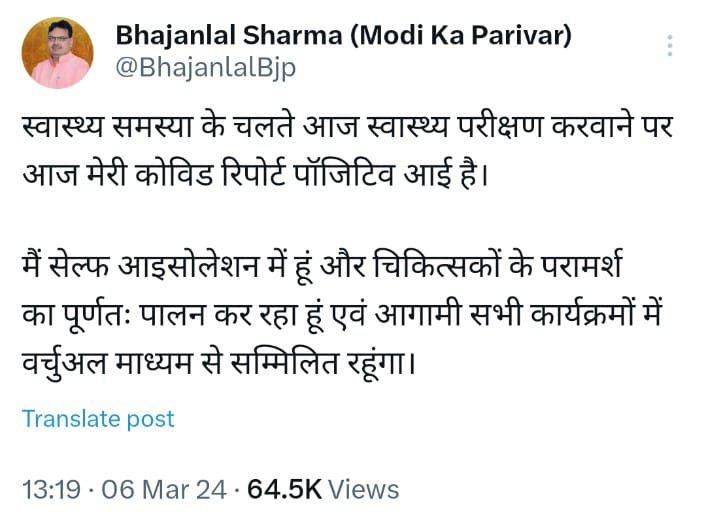 सीएम भजनलाल शर्मा ने ट्वीट कर बताया कि, ”मैं सेल्फ आइसोलेशन में हूं और चिकित्सकों के परामर्श का पूर्णतः पालन कर रहा हूं एवं आगामी सभी कार्यक्रमों में वर्चुअल माध्यम से सम्मिलित रहूंगा।’