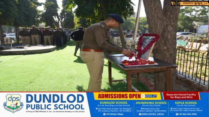 झुंझुनूं: शहीद दिवस 2026 के अवसर पर जिलेभर में पुलिस विभाग द्वारा श्रद्धांजलि कार्यक्रम आयोजित किए गए। समस्त थाना, चौकी, पुलिस लाइन और कार्यालयों में राष्ट्रपिता महात्मा गांधी को नमन करते हुए शहीदों के प्रति कृतज्ञता व्यक्त की गई। यह आयोजन देशभक्ति, त्याग और राष्ट्रीय एकता के भाव को मजबूत करने वाला रहा।