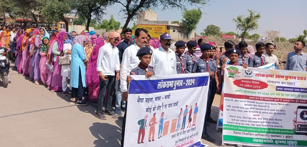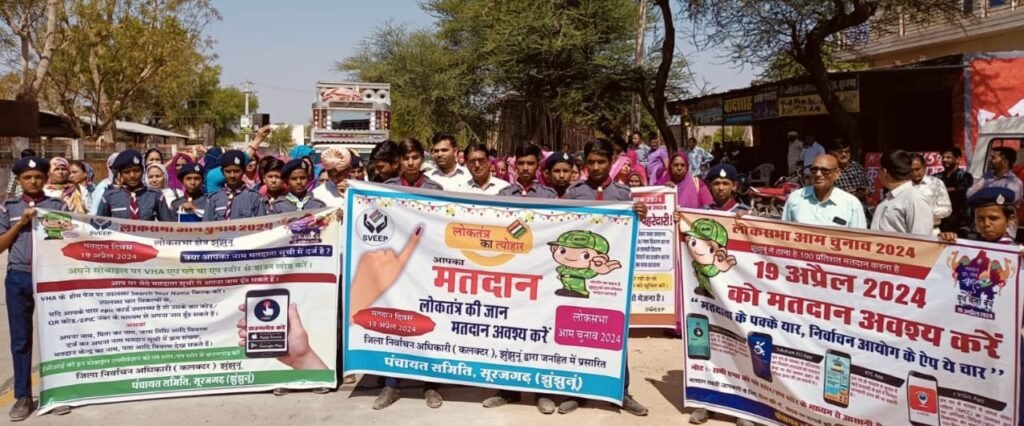 आपको बता दें की लोकसभा आम चुनाव 2024 जोरों पर है 19 अप्रैल को ज्यादा से ज्यादा मतदान कराने को लेकर आमजन को जागरूक किया जा रहा है। इसी क्रम में आज पंचायत समिति सूरजगढ़ से शूरू हुई वोट बारात काजड़ा चुंगी, चिड़ावा _ लोहारू रोड, पुराना बाजार बस स्टैंड होते हुए उपखंड कार्यालय में समाप्त हुई।