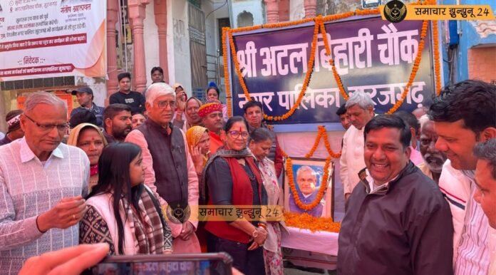 सूरजगढ़: शुक्रवार को सुशासन और विकास की सोच का जीवंत उदाहरण देखने को मिला, जब राजस्थान सरकार के सफल दो वर्ष पूर्ण होने के उपलक्ष्य में सुशासन रथ नगर पालिका चौक पहुंचा। पूर्व प्रधानमंत्री अटल बिहारी वाजपेयी की जयंती के अवसर पर आयोजित इस जनसभा में प्रदेश सरकार की उपलब्धियों, जनकल्याणकारी योजनाओं और पारदर्शी प्रशासन पर विस्तार से चर्चा हुई, वहीं नागरिकों ने पुष्पवर्षा कर सुशासन रथ का भव्य स्वागत किया।